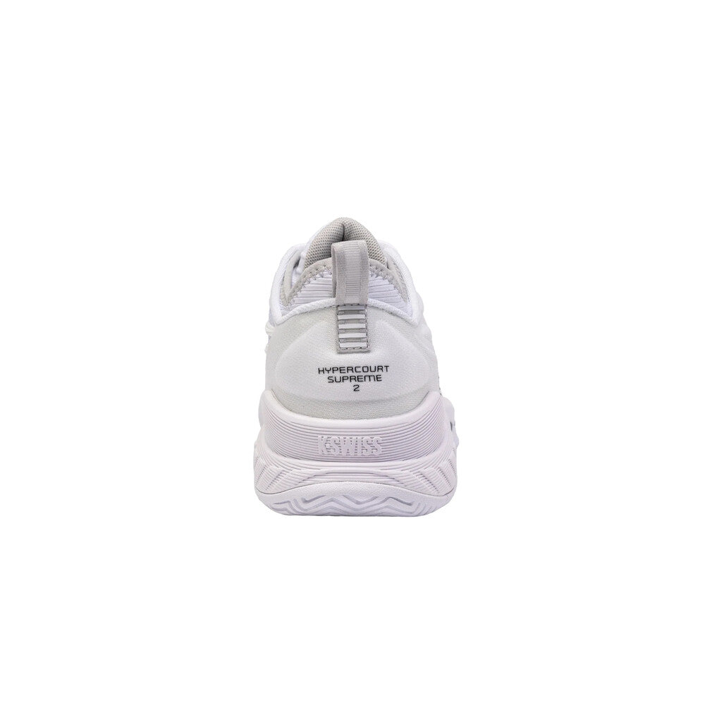 El K-Swiss Hypercourt Supreme 2 es el modelo pináculo de la hiperfamilia. Este año, K-Swiss está introduciendo una versión actualizada que tendrá un ajuste más seguro, un mayor soporte y una mayor durabilidad, al tiempo que proporcionará la máxima comodidad. La parte superior ha sido construida con Durawrap X para una excelente protección de soporte y arrastre mientras mantiene una sensación flexible mientras corre por la cancha. La entresuela de doble densidad cuenta con una espuma externa ligera Surgelite para una máxima comodidad y soporte. La espuma interior Shock Spring de alto rebote en el antepié permite una reacción más rápida en cada paso. La suela exterior de goma Dragguard 7.0 se forma en un patrón de banda de rodadura de espiga modificado para la tracción y durabilidad en todas las superficies de la cancha. El cuello de botín suave de nueva ingeniería le da un ajuste más seguro alrededor del tobillo.